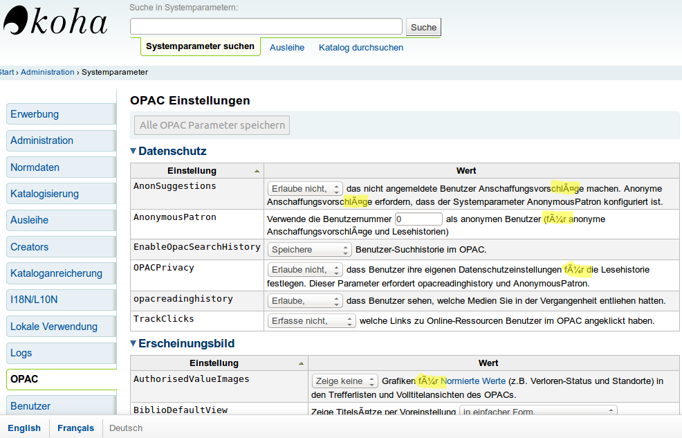Created attachment 28318 [details] Screenshot of German Logs tab in sys pref editor And while OPAC is broken, the Logs tab displays diacritics correctly.