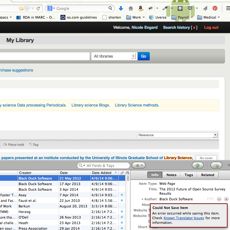 Created attachment 28562 [details] zotero error Zotero works A-OK when saving an individual title but on the results page when you click the folder in the address bar you get an error. The error gives no useful info though so I'm not sure what's causing it.
