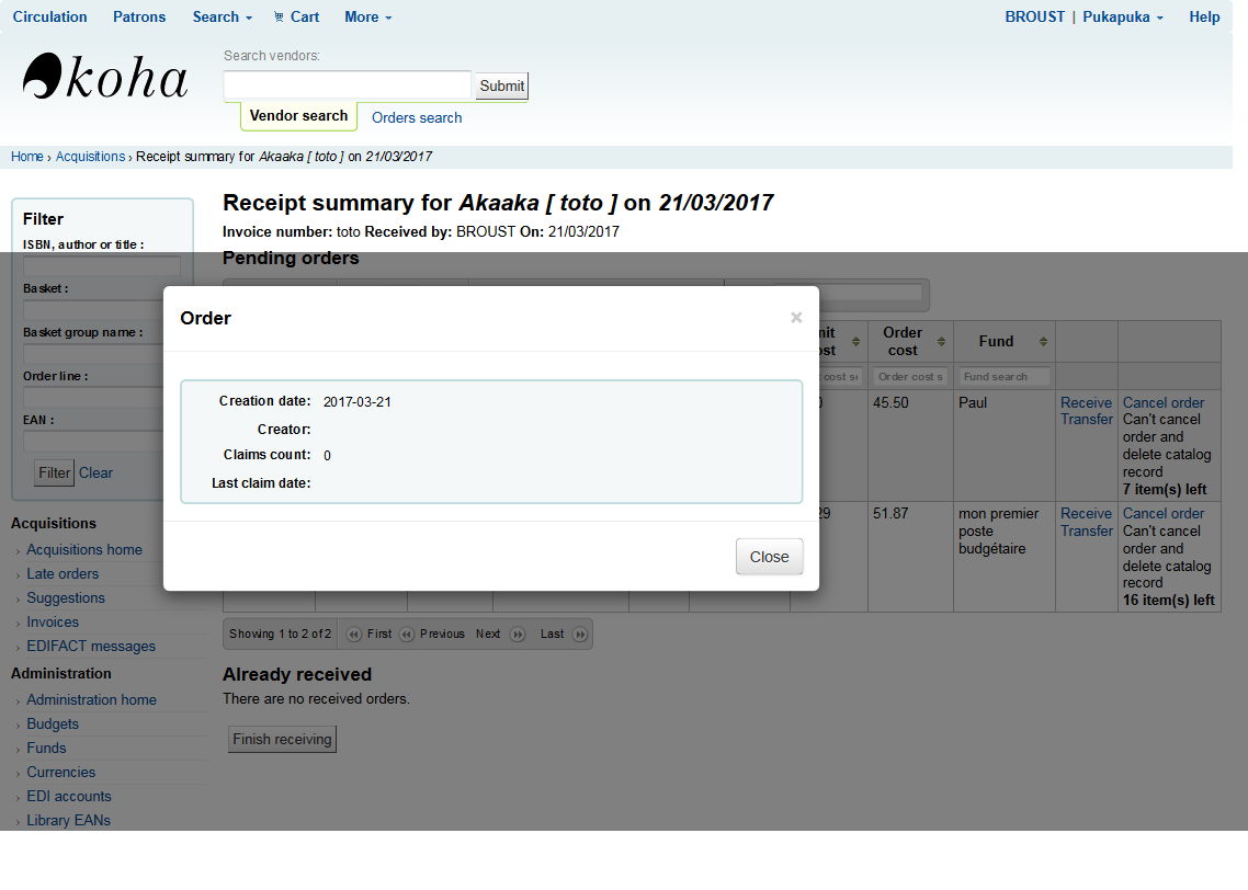 Starting on this... - QA script OK - Code review OK ------------------- 1) New test is failing for me: not ok 8 - Koha::Acquisition::Order->insert set created_by to logged in user if not given # Failed test 'Koha::Acquisition::Order->insert set created_by to logged in user if not given' # at t/db_dependent/Acquisition/NewOrder.t line 91. # got: undef # expected: '42' # Looks like you failed 1 test of 8. 2) Why only display the order line creator during the receive process, but not on the order pages? We can only see the basket creator there. 3) On the order receive page: Maybe we should write "Ordered by" instead of "Created by"? 4) On the parcel page: You change the display for the unreceived order lines table, but the received orders miss the link to the order. I think it would be better to be consistent and also to keep the | for separating the links from each other. 5) The popup window appers 'unstyled' - for example it appears in a much bigger than the rest serif font for me. Maybe something for a follow up? Could you please take a look? Especially at the failing test and 4)