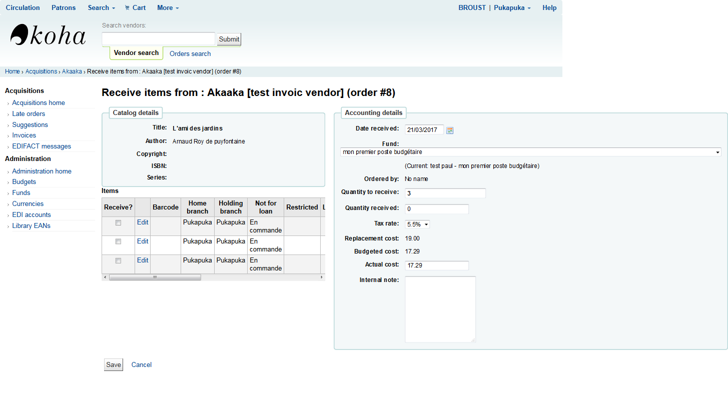 on the order receive page (http://pro.test2.biblibre.com/cgi-bin/koha/acqui/orderreceive.pl?ordernumber=7&invoiceid=3) there's Ordered by: No name ...