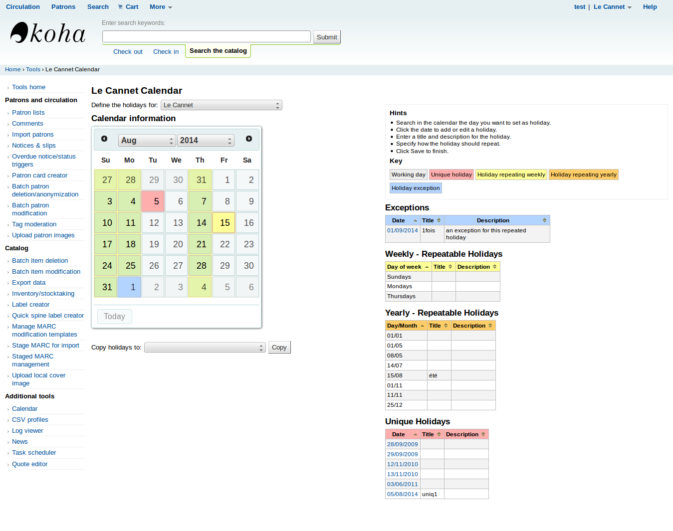 Created attachment 29130 [details] [review] [PASSED QA] Bug 12458 - Holidays calendar has wrong colors for weekly and yearly repeatable In Tools / Calendar, the colors in the calendar for weekly and yearly repeatable are different from the color of the "Key" legend. This patch sets the colors used in the "Key" legend to the cells if calendar. Test plan : - Go to Tools/Calendar - Add a weekly repeatable holiday - Check its color in calendar is the same as the text "Holiday repeating weekly" => Without this patch, it's green instead of yellow - Add a yearly repeatable holiday - Check its color in calendar is the same as the text "Holiday repeating yearly" => Without this patch, it's yellow instead of orange - Check the color of others holydays types are OK Signed-off-by: Nicole C. Engard <nengard@bywatersolutions.com> I'd like to see today's date a clearly different color from the weekly repeated holiday, because now they're close in color. But this patch does exactly what it says and should so I'm signing off. Signed-off-by: Katrin Fischer <Katrin.Fischer.83@web.de> Legend, headings and calendar colors now match. No problems found.