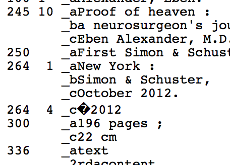 (In reply to Nicole C. Engard from comment #2) > For testing you can use ISBN: 9781451695182 That ISBN will return a variety of records depending on the Z39.50 source. I've run into what looks like the same issue though. I'm seeing stuff like this in some MARC records we get from OCLC: =264 \4$c�2001