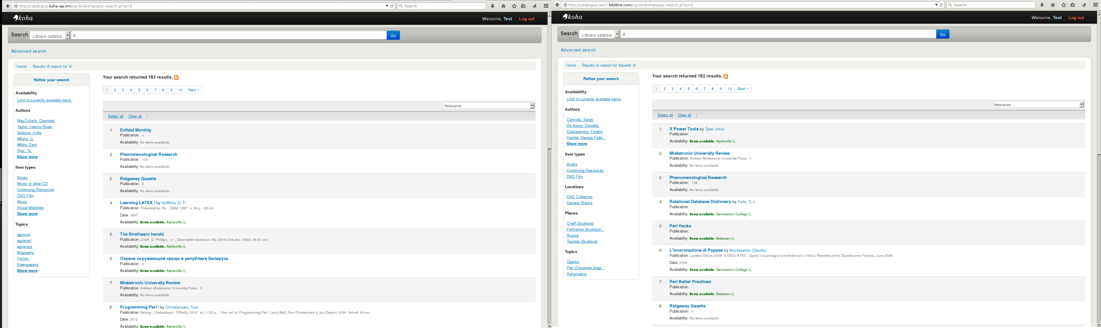 Me again :) So, I have tried to do some tests locally using your branch (OPAC biblio search only). The first problem I got was to find a MARC21 DB (since the UNIMARC mappings are not defined, I cannot test with an UNIMARC DB). I have used the one created for the sandboxes (http://git.koha-community.org/gitweb/?p=contrib/global.git;a=blob;f=sandbox/sql/sandbox1.sql.gz;h=19268bccb43b2a33d5644b7d86cbb1abb323016b;hb=HEAD). But there are only 436 biblios, it's not enough to test some stuffs (facets for instance). Or maybe you can share your DB? Here some notes: 1/ Add deps to C4/Installer/PerlDependencies.pm 2/ The number of tests provided is very low. 3/ catalyst/elastic_search is 1004 commits behind origin/master, please rebase 4/ The message "No 'elasticsearch' block is defined in koha-conf.xml" should be raised before starting the indexation process, and not on commiting the first batch. 5/ You really need to tune the default value for the commit :) commit 100: perl misc/search_tools/rebuild_elastic_search.pl -b 77.57s user 0.86s system 91% cpu 1:25.62 total commit 1000: perl misc/search_tools/rebuild_elastic_search.pl -b 24.68s user 0.52s system 79% cpu 31.595 total For Solr, we used 5000. Yes I know, it's configurable. 6/ Verbose does not work as expected, it could be fixed with - print $msg if ($verbose <= $level); + print $msg if ($verbose >= $level); 7/ perl -e "use Pod::Checker;podchecker('misc/search_tools/rebuild_elastic_search.pl')"; *** WARNING: empty section in previous paragraph at line 36 in file misc/search_tools/rebuild_elastic_search.pl *** ERROR: =over on line 38 without closing =back at line EOF in file misc/search_tools/rebuild_elastic_search.pl 8/ 2 occurrences of "Solr" reintroduced in installer/data/mysql/sysprefs.sql and koha-tmpl/intranet-tmpl/prog/en/modules/admin/preferences/admin.pref 9/ Test! I have launched some searches, with the same DB (the one from the sandbox). On a local using your remote branch and another one using master (sandbox7 provided by BibLibre). a. Search for 'd' (screentshot opac_search_for_d_sort_by_relevance.png ES on the left, Zebra on the right). Main differences: - 183 vs 182 results (?) - the order is not the same (make sense) - Locations and Places facets are missing - 6 entries are displayed in the facets for ES (current behavior is 5). b. Search for 'd', sort by title AZ (screenshot opac_search_for_d_sort_by_title.png) - Zebra displayes only 1 facet - The order is still completely different c. Search for 'harry', sort by title AZ (screenshot opac_search_for_harry_sort_by_title.png) - 'Show more' links is displayed even if only 2 entries for a facet are available - The order is still different ("The discovery of heaven" should be sorted either before Dollhouse (if the is a stopword) either after "Hareios*" - The availability is wrong for ES (The item for Dollhouse is not for loan) d. Search for Books (limit by item type in the adv search), sort by pubdate (screenshot limit_by_book_sort_by_pubdate.png) - "Return to the last advanced search" link is not displayed - The item types facet contains several entries, which does not make sense - The number of results highly differ (395 vs 364) - The order is still completely different. I had a look in the index and found: "Pictura murală*" has "pubdate":"||||" (/_search?q=_id:39&pretty) The Korean Go Association's learn to play go "pubdate":"uuuu" (/_search?q=_id:155&pretty) Where do come from these values? Shouldn't be a date, or at least an integer? It's not easy to know what is indexed where. Did you have a look at the indexes configuration page the Solr stuff had? It provided an interface to configure the different mappings, it was very useful.