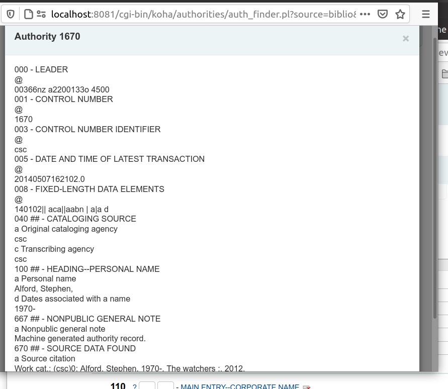 Created attachment 112104 [details] [review] Bug 12533: Improve authority search result display This patch implements a few changes in the way authority records are displayed in search results. - In most cases heading type is now displayed as a separate column in the table of search results. - The heading itself is now linked rather than a separate "details" link. In the authority search results for MARC editor plugins the heading link triggers a modal with the authority details instead of linking to a separate page. To test, apply the patch and go to Authorities. - Perform an authority search which will return results. - In the search results headings should be linked to the corresponding detail page. - There should be a separate column for heading type. - Go to Cataloging and create a new record using a framework which has a field linked to an authority type (e.g. 100a -> PERSO_NAME ). - Perform a search which will return results. - In the search results, clicking a heading link should trigger a modal window with the authority details. - Test multiple entries in the results and confirm that each time the correct data is loaded into the modal window. - Test the same process for a field which is linked to the unimarc_field_210c.pl plugin. - Go to Tools -> Batch record modification and submit multiple authority record numbers. - In the results list the heading should be linked correctly to the corresponding detail page. Heading type is not present in this view. - Perform the same test with batch record deletion. Signed-off-by: Claire Gravely <claire.gravely@bsz-bw.de> Signed-off-by: Marjorie Barry-Vila <marjorie.barry-vila@collecto.ca>