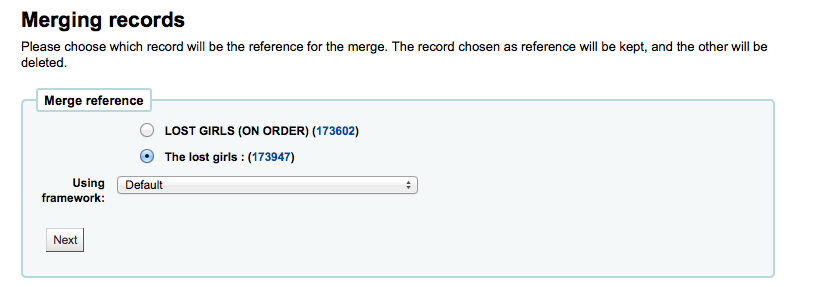 Created attachment 30007 [details] [review] Bug 12629 - Software error when trying to merge records from different frameworks Test Plan: 1) Choose a bib record that has the default framework. 2) Add a second record using that fast add framework. 3) Merge the records; switch to "Using framework: Default", and choose the original record (i.e. the one that had the default framework) as the merge reference. Clicking 'Next' will trigger the error. 4) Apply this patch 5) Repeat steps 1 - 3, no error should occur