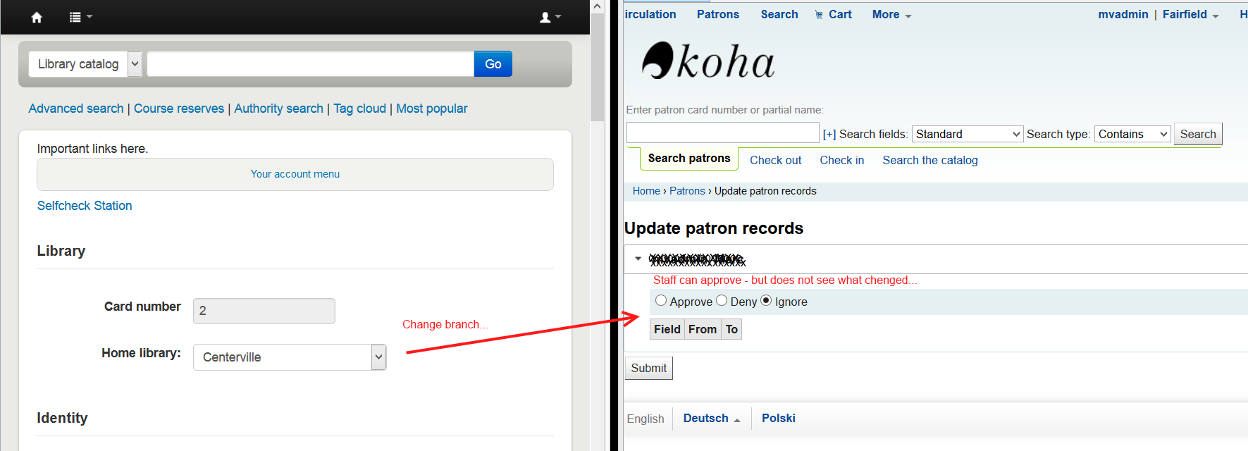 Created attachment 30570 [details] [review] Bug 12698 - If user changes home library in Opac change is not visible in staff client To test: - Set opacuserlogin and OPACPatronDetails to allow - Log in to OPAC, go to 'your personal details' - Change Home library - Go to staff client: Patrons requesting modifications (/cgi-bin/koha/members/members-update.pl) - Without patch, you do not see the change request, but can Approve, Deny or Ignore it - With patch, you see the change request, indicating the Home library (branchcode) Signed-off-by: Nick Clemens <nick@quecheelibrary.org> Signed-off-by: Marcel de Rooy <m.de.rooy@rijksmuseum.nl>