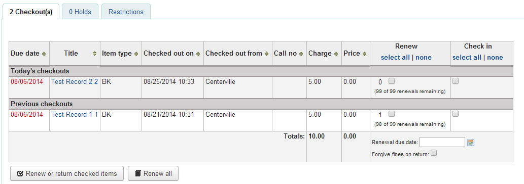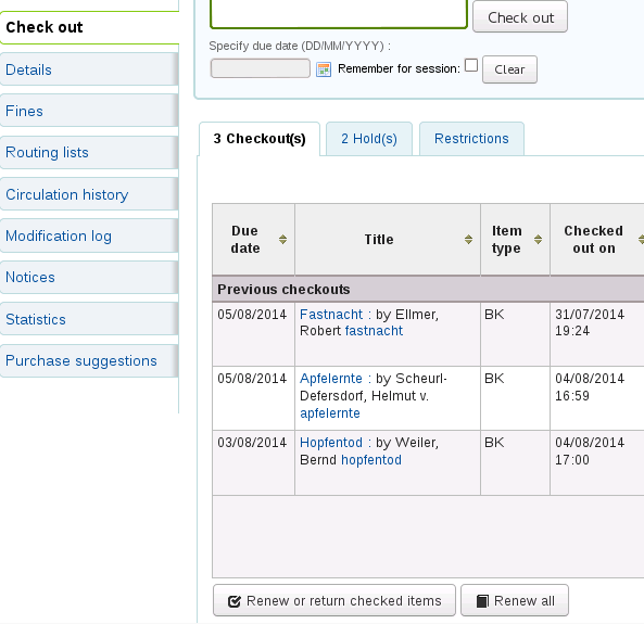 Hm, only difference I can see is that the checkout date in my table doesn't show a time, but only a date now - on your screenshot it does? This is the source code of my checked out item: <tr id="group-id-issues-table_-strong-previous-checkouts-strong-"> <td class="group -strong-previous-checkouts-strong-" colspan="10"> <strong>Previous checkouts</strong> </td> </tr> <tr id="480-1" class="odd group-item group-item--strong-previous-checkouts-strong-" data-group="-strong-previous-checkouts-strong-"> <td class="">10/08/2014</td> <td class=""> <span class="strong"> <a href="/cgi-bin/koha/catalogue/moredetail.pl?biblionumber=30&itemnumber=480#480">transf</a> </td> <td class="">CF</td> <td class="">25/08/2014</td> <td class="">Midway</td> <td class=""></td> <td class="">0.00</td> <td class="">0.00</td> <td class=""> <span> <span style="padding: 0 1em;">2</span> <span class="renewals-disabled">Not renewable</span> <span class="renewals-allowed" style="display: none"> </span> </td> <td class=""> <input id="checkin_480" class="checkin" type="checkbox" value="480" name="checkin"> </td> </tr>