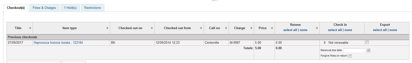 Created attachment 31735 [details] Columns misplaced After applying Bug 12899, in moremember page, checkouts table has misplaced columns. There's lack of 1 column in template, the same as in patch for 12899 in circulation.tt