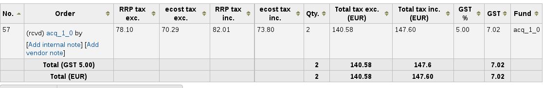 Thanks, Jonathan. I've tested again against master 3.17.00.025, about the 1 cent' differences. -------------------------------------------------------- II - Configuration 2 (1 1) List item price includes tax Invoice item price includes tax file-doc says: 7) On the basket group (pdf English 3-page) ... gstvalue = 7.03 but I see: gstvalue = 7.02 NB. at point 10 (parcel.pl), file-doc is right. Koha shows "(Tax exc.)" on the left of the "Subtotal for ...", but this Subtotal shows 147.60, which is the Tax inc. . So the string "(Tax exc.)" is wrong, is misleading. -------------------------------------------------------- III - Configuration 3 (1 0) List item price includes tax Invoice item price does not include tax: file-doc says: 2) On the basket page (basket.pl rrp_it = 82.01 but I see: rrp_it = 82.00 file-doc says: 7) On the basket group (pdf English 3-page) ... gstvalue = 7.03 but I see: gstvalue = 7.02 -------------------------------------------------------- IV - Configuration 4 (0 1) List item price does not include tax Invoice item price includes tax: the file-doc is perfect. Al point 10 parcel.pl, file-doc is right. Koha shows "(Tax exc.)" on the left of the "Subtotal for ...", but this Subtotal shows 154.98, which is the Tax inc. So the string "(Tax exc.)" is wrong, is misleading, as in conf II. -------------------------------------------------------- I don't know if these differences of 1 cent are so substantial. In doubt I pass the patch to "Failed QA" status.