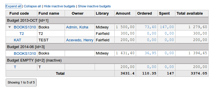 Created attachment 32816 [details] [review] [PASSED QA] Bug 12984: Improvement of the funds list view - acqui home Bug 11578 improved the funds list view in the administration module. It would be great to have the same improvement on the acquisition home page. This improvement groups funds by budget and displays them with a hierarchy. Test plan: 0/ Create a budget and fund hierarchy, with active and inactive budgets. 1/ Go on the acquisition home page and verify the values are the same as before 2/ Verify the funds are correctly listed 3/ Verify the links on top of table work (expand/collapse all, show/hide inactive budgets). Signed-off-by: Paola Rossi <paola.rossi@cineca.it> Signed-off-by: Katrin Fischer <katrin.fischer.83@web.de>
