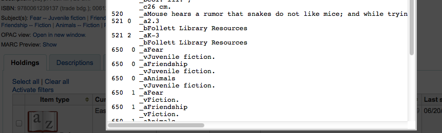 Created attachment 32796 [details] example marc preview in staff When you're in the staff client and click the marc preview you link you have to scroll left to right to see the whole thing because it doesn't wrap. In the OPAC it looks much cleaner. Could we use that layout in the staff client since the staff are the people who care about MARC - not the patrons.