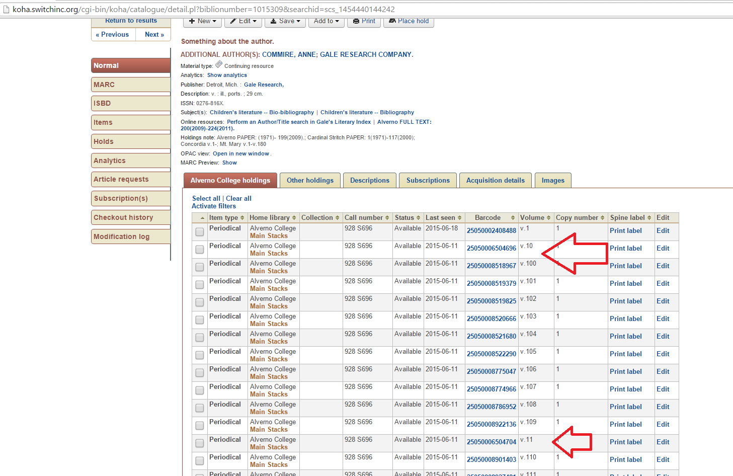 This is a pet peeve of mine. If a missed serial is donated at a later date, I never get to see my serials in sequential order, because sorting by Vol replicates what is seen above, while sorting by call number alphabetizes them so all Aprils (regardless of year) are before all the Novembers. The only way they are in order is if my barcodes are in order; that only happens if no issues are missed or go walking.