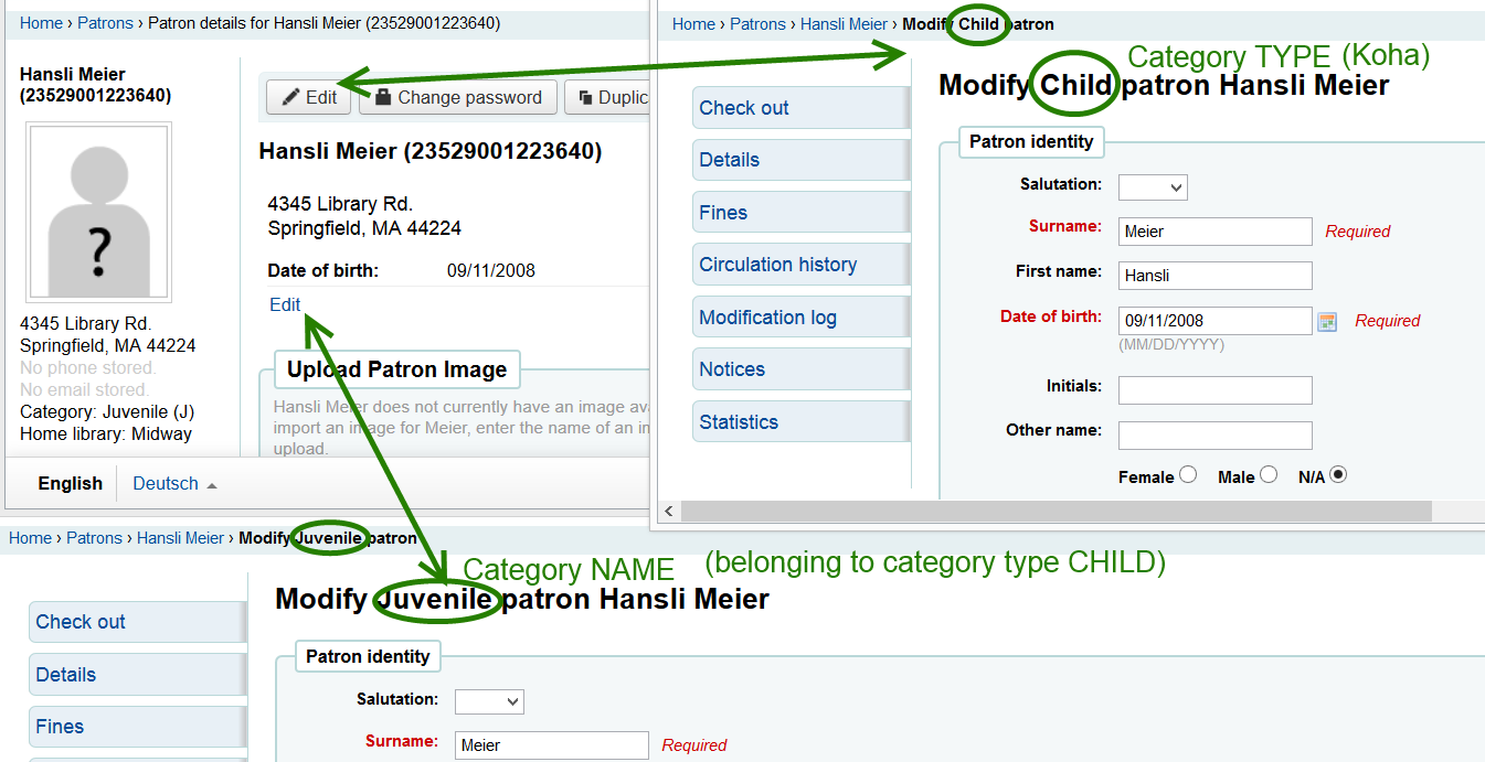 No problem,I think the whole code is rather complicated. Please have a look at the proposition in my 2nd screenshot: The idea is to have both Category TYPE and category NAME, something like Modify patron Hansli Testmann (Child:Juvenile) ([TYPE]:[NAME]) If you think this would be OK I will provide a new patch.
