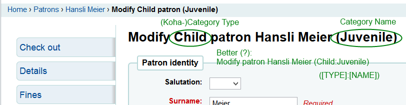 Hm, bit confused - the description says it moves the category to the end, but that doesn't match what I see in the templates: When I edit an existing patron: Title: Modify Child patron <name> Breadcrumb: Home › Patrons › <name> › Modify Child patron Modify Adult patron Nicole Schneider Home › Patrons › Nicole Schneider › Modify Adult patron Double checked patch is applied and looking at the English templates. The categoryname at the end doesn't show up for me.