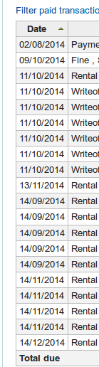 The date sorting in the new datatable on the first 'fines' tab in the patron account is off and not working correctly.