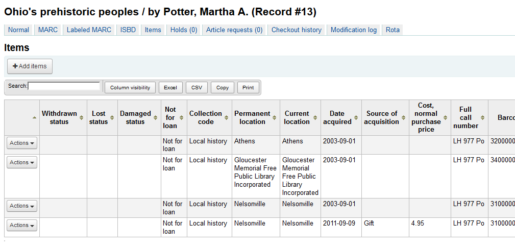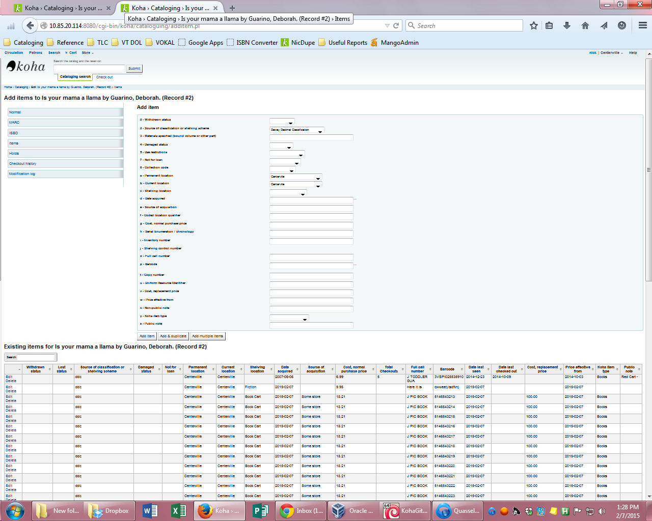 I'm just looking at this for the first time, and I am a cataloger.:) I would love ANYTHING that gets me away from scrolling down through 200+ items to add an item!!! I can live with the modal--I often copy from an existing item in the table & paste into the new item, and with the model I'd simply do that from another browser tab, easy-peasy. My dream is that the "Actions" buttons (on the items in the item table) would have a "Duplicate" action that would allow me to clone an item that duplicated that item exactly except for $d and $p and I could then add a new barcode, edit the $h and/or $t and be done. Until then, this modal add item is a HUGE improvement. (Now, if I could get that "Duplicate" in the "Actions" button and launch that new item modal like this, I'd be living the dream!) I like the "View" button. I'm most often going directly from item editing to bib record editing (with Advanced Editor/Rancor), so don't mind one more click to get to "Normal." (I edit items first then go to Rancor because starting with Rancor then "Edit items" opens editing the items another tab, which I find annoying--I'd prefer it staying in the same tab.)