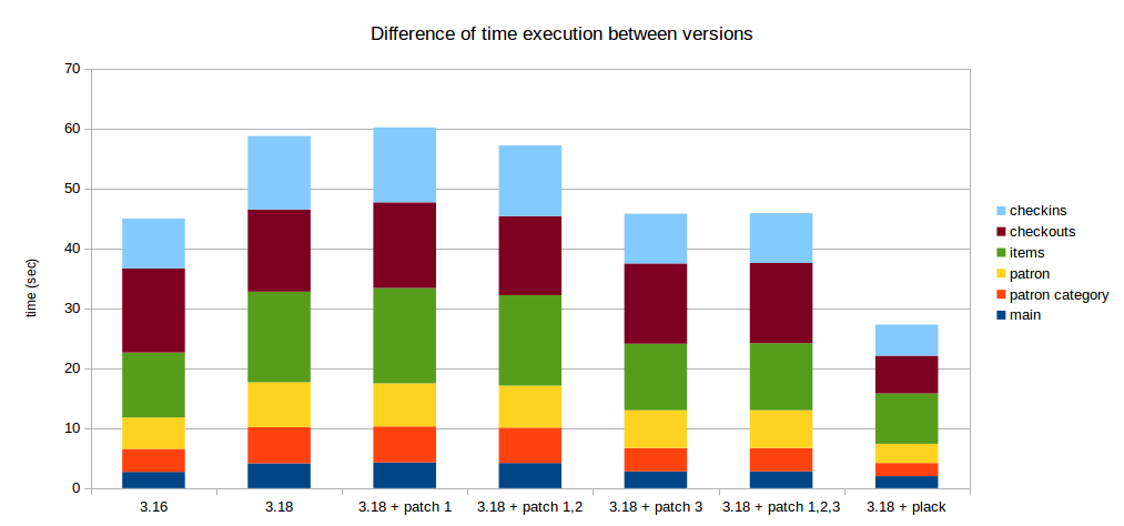 (In reply to Jonathan Druart from comment #2) > And... with Plack? > =3.18 + Plack= > CP main = 1.86 + 2.16 + 1.81 + 1.66 + 2.26 => 2 > CP add patron category = 2.23 + 2.10 + 2.32 + 2.25 + 2.17 => 2.2 > CP add patron = 3.27 + 2.89 + 3.17 + 3.29 + 3.38 => 3.2 > CP add items = 8.50 + 8.75 + 8.45 + 8.05 + 8.00 => 8.4 > CP checkout = 6.76 + 6.26 + 5.74 + 6.79 + 6.16 => 6.3 > CP checkin = 4.80 + 5.35 + 4.82 + 5.60 + 5.44 => 5.2 > > Whaou, cool :) 3.18 with Plack and this patch or without this patch ? (next step according to me: improve checkout !