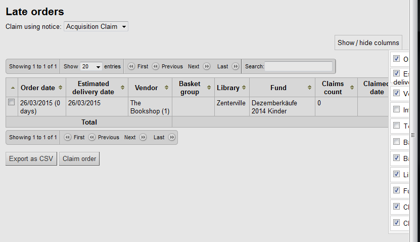 Created attachment 37524 [details] [review] [PASSED QA] Bug 13864: Columns configuration - Late orders This patch adds the ability to hide columns on the late orders page (acqui/lateorders.pl). Test plan: Go on the late orders page and confirm you are able to hide columns. You can also play with the columns configuration admin page and confirm that the behaviors are consistent. Signed-off-by: Marc Véron <veron@veron.ch> Signed-off-by: Katrin Fischer <katrin.fischer.83@web.de> http://bugs.koha-community.org/show_bug.cgi?id=13875