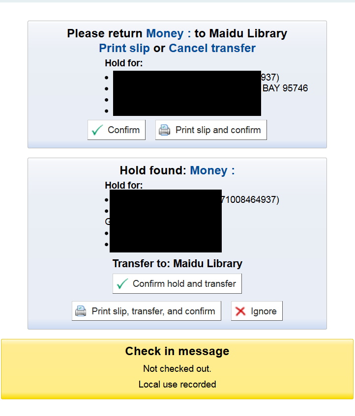 Example: If an item is checked in at library A, and the item needs transferred to library B, *and* there is a hold for pickup at library B, the librarian will see a dialog box for both the transfer and the hold.