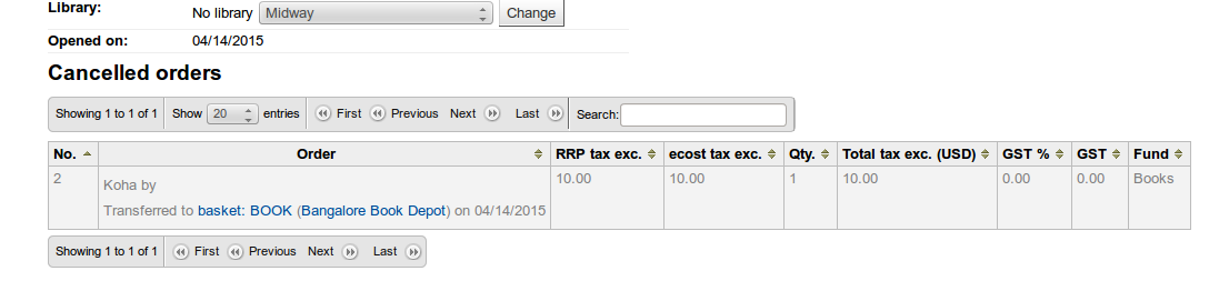Created attachment 37798 [details] [review] Bug 13993 - Transfer order from one vendor to another vendor previous orderstatus is not changed Transfer order from one vendor to another vendor previous orderstatus is not changed To Test: 1) Create a vendor for ex: A 2) Create a basket under vendor A 3) Create a order 4) Create a vendor for ex: B 5) Create a basket under vendor B 6) Search vendor A and basket/order 7) Click on Transfer link and choose the vendor and basket in which you want to transfer the order 8) Go to mysql prompt and see previous orderstatus. For ex: mysql> select orderstatus from aqorders where ordernumber = 2; +-------------+ | orderstatus | +-------------+ | cancelled | +-------------+