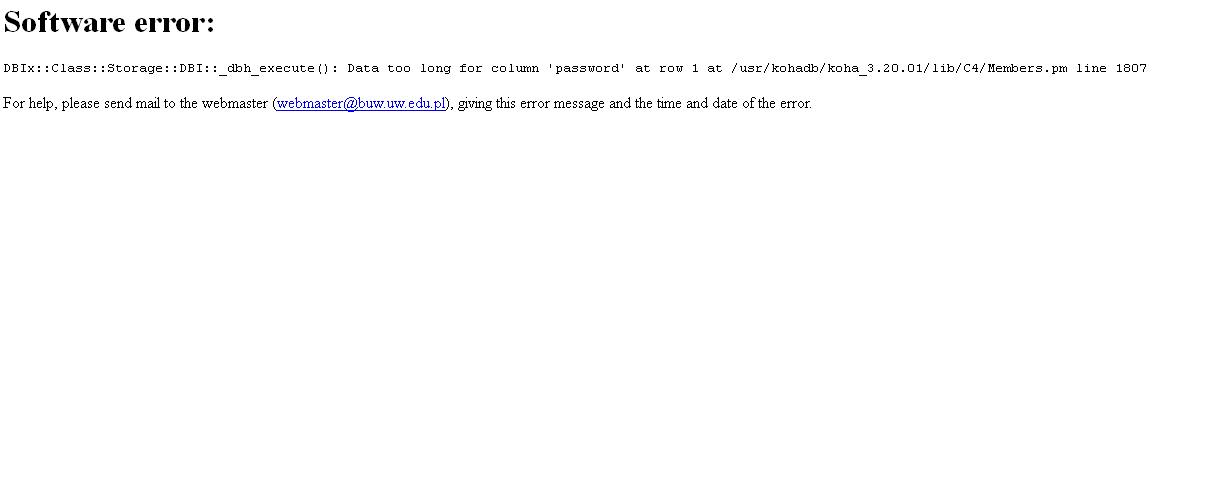 (In reply to BUWM from comment #9) > Created attachment 43437 [details] > error when deleting patron > > We also had problem with deleting patrons. > `borrowers` . `password` was VARCHAR(60), while > `deletedborrowers` . `password` was VARCHAR(30). Setting the latter to 60 > resolved this issue in our case (Koha 3.20.01) This will be fixed by bug 15517.
