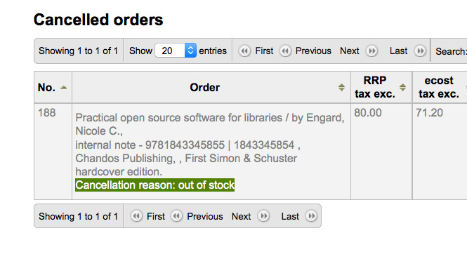 (In reply to Nicole C. Engard from comment #0) > Created attachment 38672 [details] > cancelled on basket only > > Right now if you cancel an order it doesn't show under on the receiving page > as a confirmation (under already received would make sense) and it doesn't > show on the invoice. This item can only be seen in the basket, but most > people want to know what was cancelled on their invoice. > > Side note - you also can't find it by doing an order search. This can't quite work as suggested, as there is no link between the invoice and the cancelled orders. You'd have to somehow make that link manually after it was cancelled (when it's cancelled before receiving from the basket page) or we could make the link when it's cancelled from the receive page. But I wonder if that is really necessary?