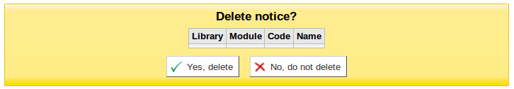 Created attachment 39270 [details] 'print'-only notice deletion confirmation dialog Shows the <td>s not being populated. Clicking the 'Yes, delete' button will submit the page without any apparent error. But the record will not be deleted.
