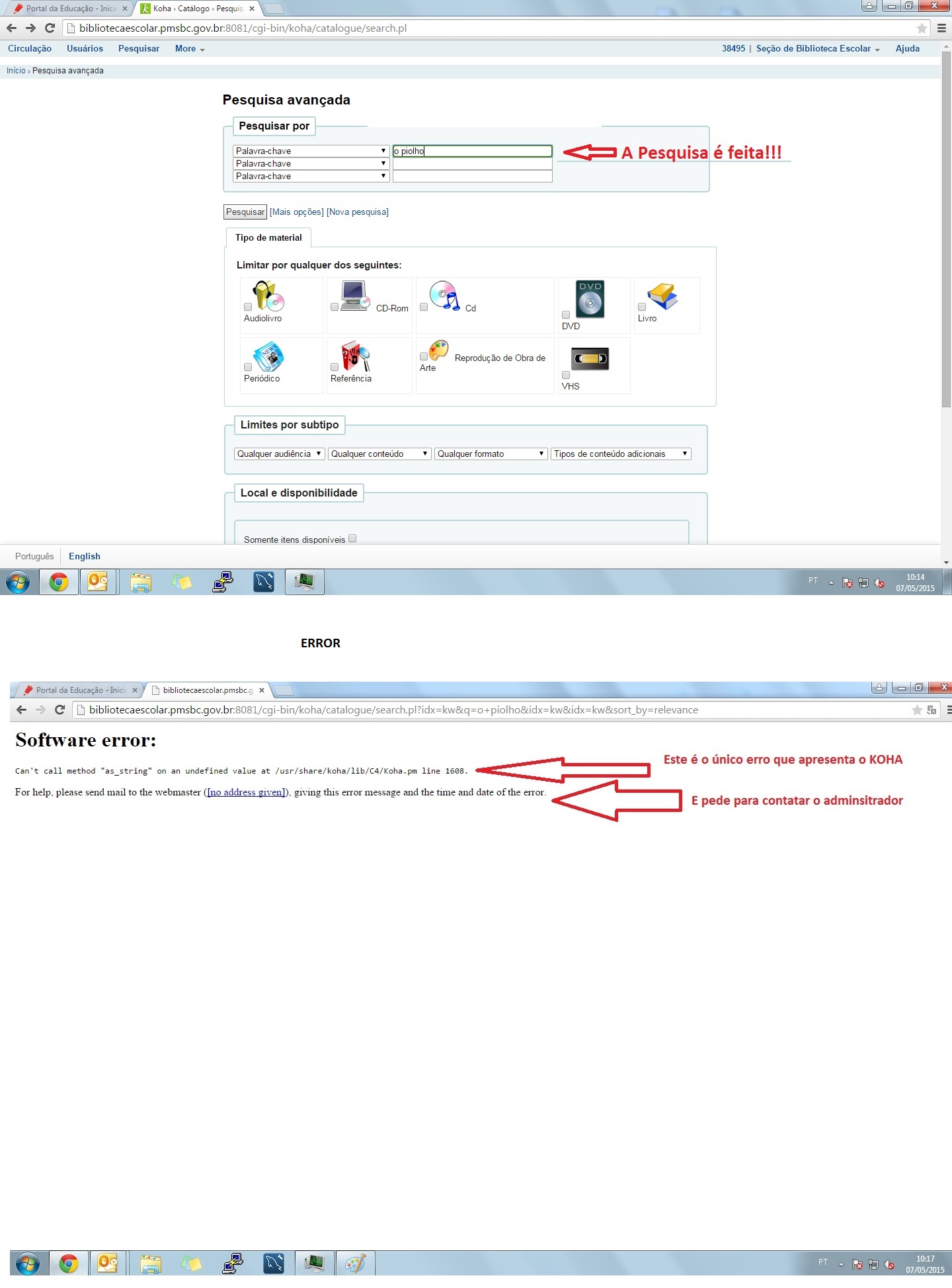 Created attachment 39483 [details] this is one study that cause error ! hi, When you enter for example ( The Louse ) a book name in Brazil , in search field, Koha brings this error message : Software error : Can not call method " as_string " on an undefined value at /usr/share/koha/lib/C4/Koha.pm line in 1608 . For help , please send mail to the webmaster ( [no address given Beheerder ] ) , giving this error message and the team and date of the error . And I am not able to resolve this error , with other books and authors , even when the base it does not bring me to search information or catalog . I hope you can help me solve this error as soon as possible ! Grateful ! Anderson Goes