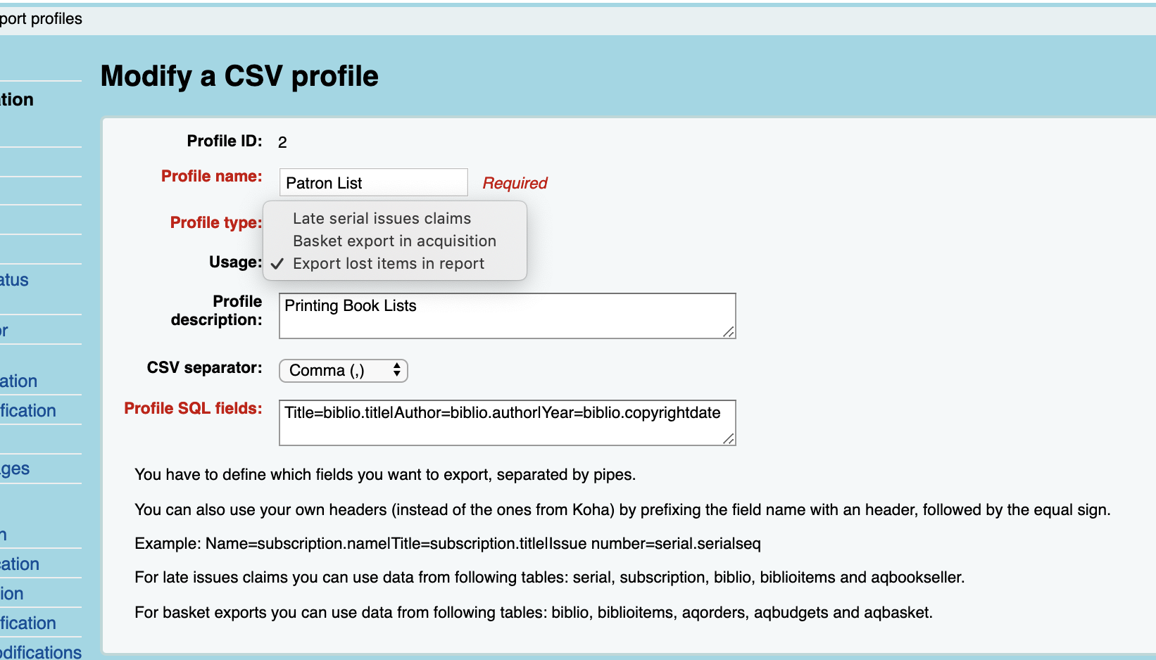 Katrin, I posted an attachment - has Koha changed? Now, when a CSV profile is created, there is a dropdown menu of 3 options where these profiles will display- and these profiles no longer display in the Download cart/list feature. The manual does not match what I current see on the Koha version 18.05.08. Kelly