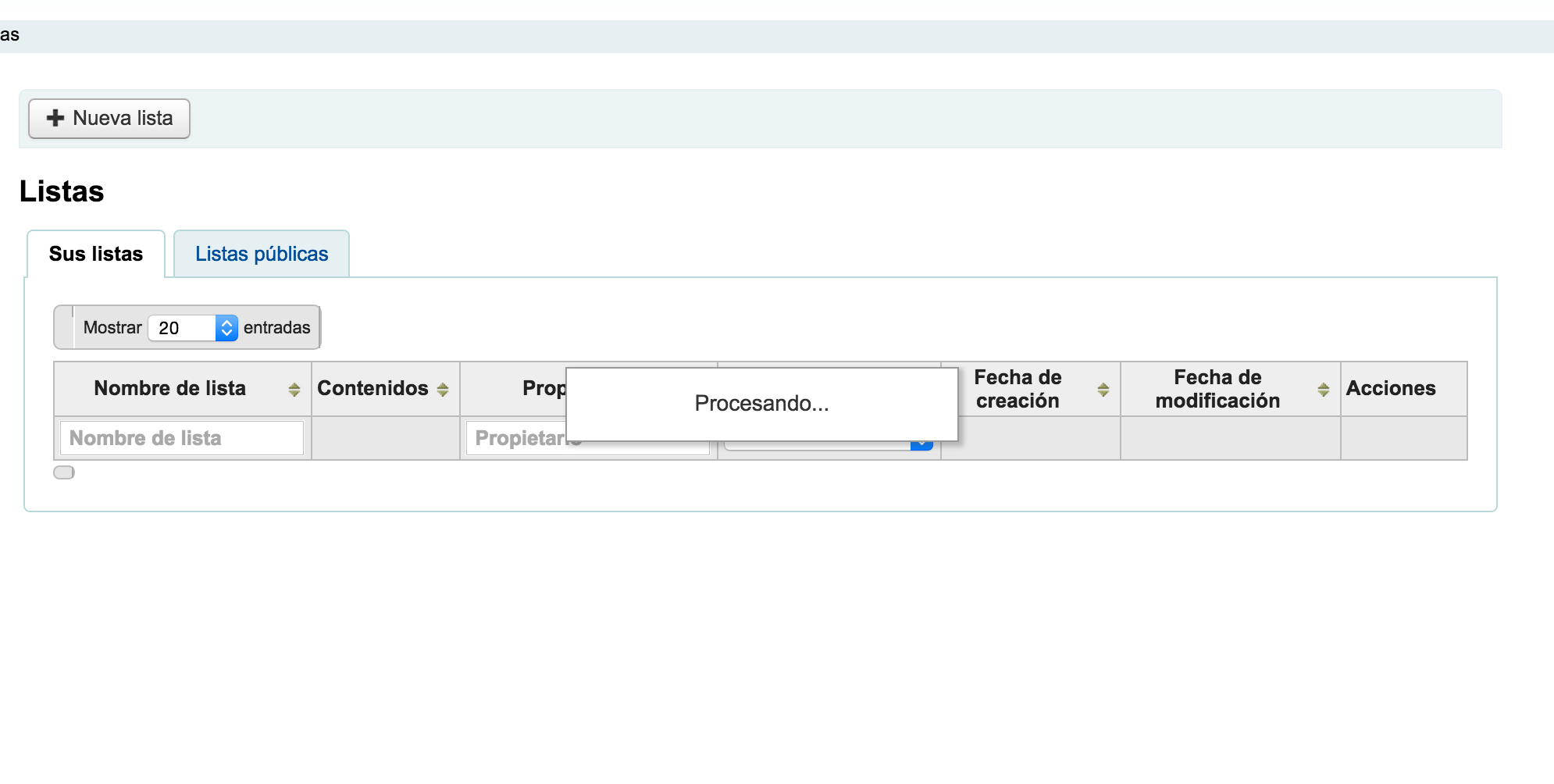 This bug affects (at least) master and 3.20.x. To reproduce: - On the staff interface create a private list - Go to More > Lists ('Your lists' tab) => SUCCESS: Your private list is shown. - Translate the templates to any language like: $ cd misc/translator/ $ perl translate install es-ES - Enable the translated templates on the sysprefs - Switch to the translated language - Go to the lists page (Mas > Listas in es-ES) => FAIL: The datatable hangs waiting for the svc/shelves script to return data
