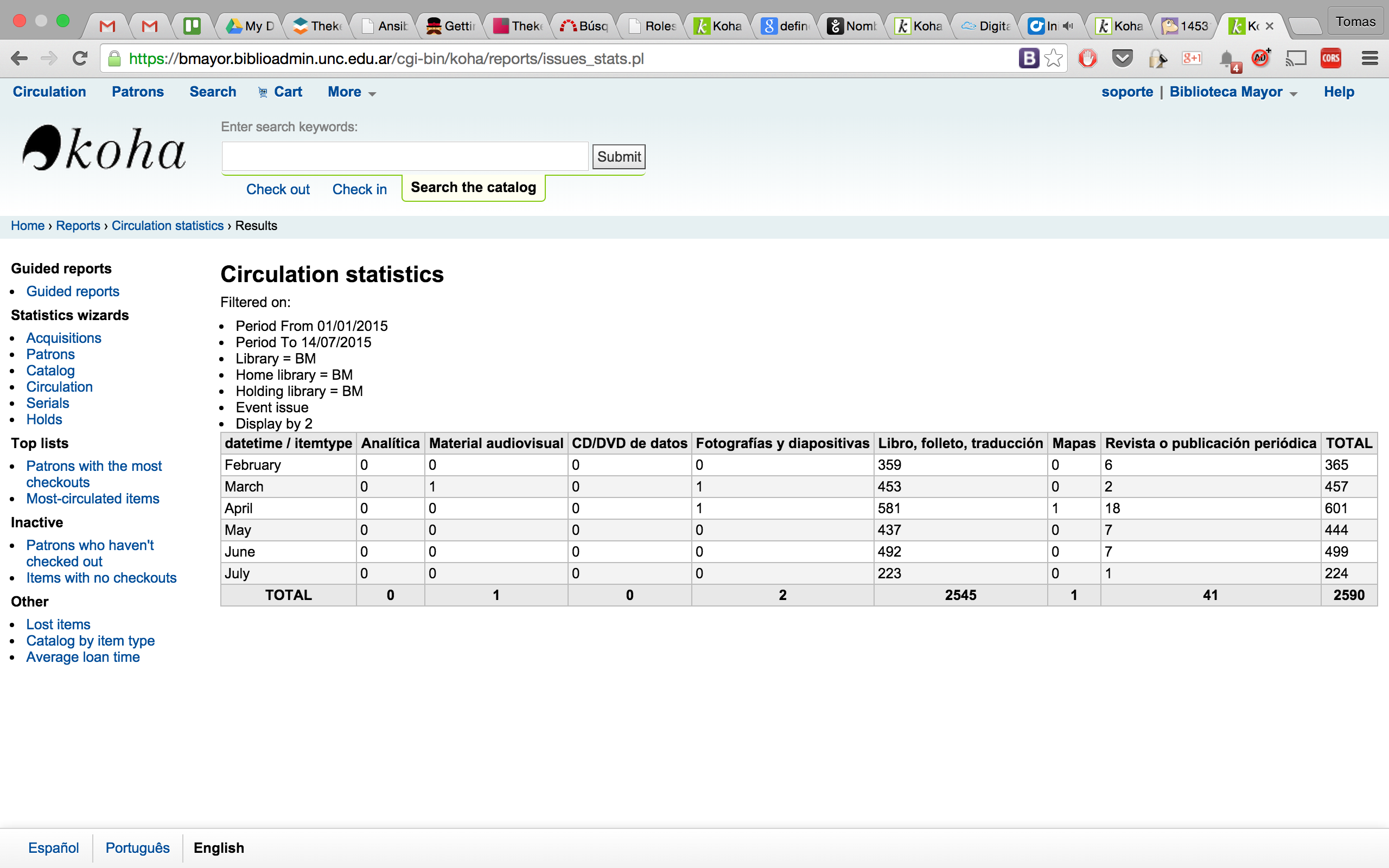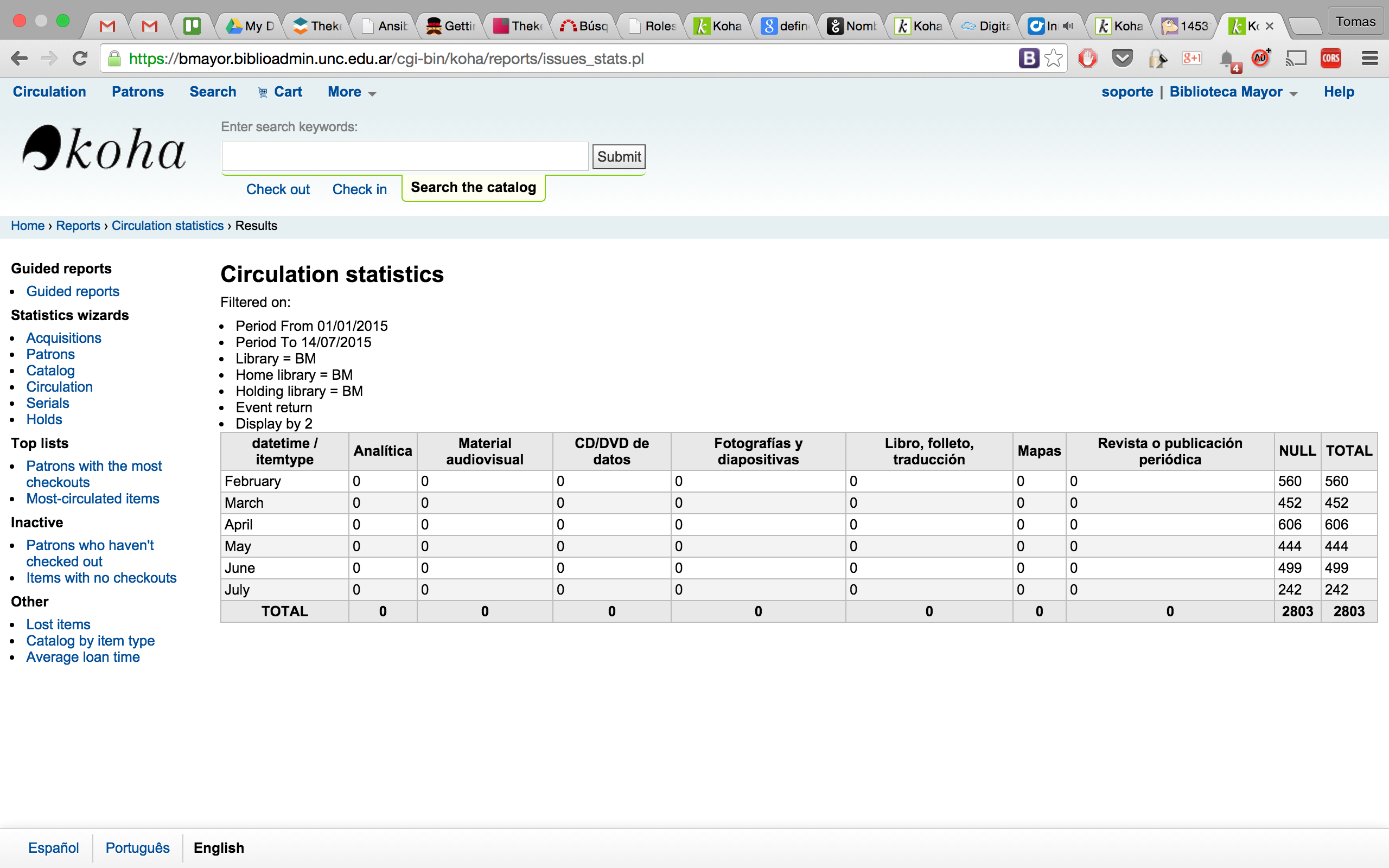 The check-ins statistical report shows wrong data (at least) if you choose itemtype -> column and grouping by month. Steps to reproduce: - Go to Reports > Circulation statistics - Choose a period (row) when there is circulation - Choose to group 'Checkout' by month - Run report => SUCCESS: you see checkouts numbers by month and by item type - Go back and choose to group 'Checkin' by month - Run report => FAILURE: you see all cells contain zeros (and they shouldn't) and there is a weird NULL column, with the sum of the checkins (same value as 'Total' column).