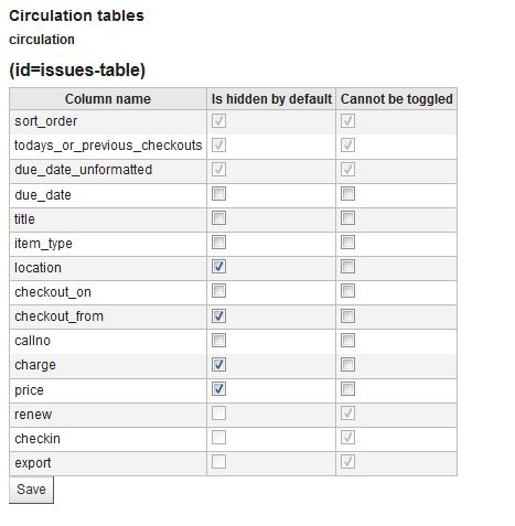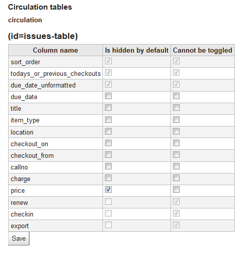 Hi Jonathan John Yorio submitted this one on our behalf - we found it when fist upgraded to 3.20.02.000. Might have been fixed along the way since then. I can confirm it still happens in our live system. I hope this will clarify the symptoms: It is a mismatch between the show/hide column names in Administration and those that appear in circulation. Koha admin - Columns settings - Circulation Set Charge and Price to Hidden by default Expected result: For checkout display not to show Charge or Price. This is what ACTUALLY happened: Checkout still shows Price. Fine disappears! Drop-drown to show/hide that is in the checkout screen - does not list hide Price at all. Seems the programmers mixed up the Price and Fine fields. In the Admin module - hiding Price actually hides Fine, and Fine is not listed in the Columns Settings table at all. In the checkout screen drop-down - the fields seem to be correctly named, and hide Price is simply not an option.