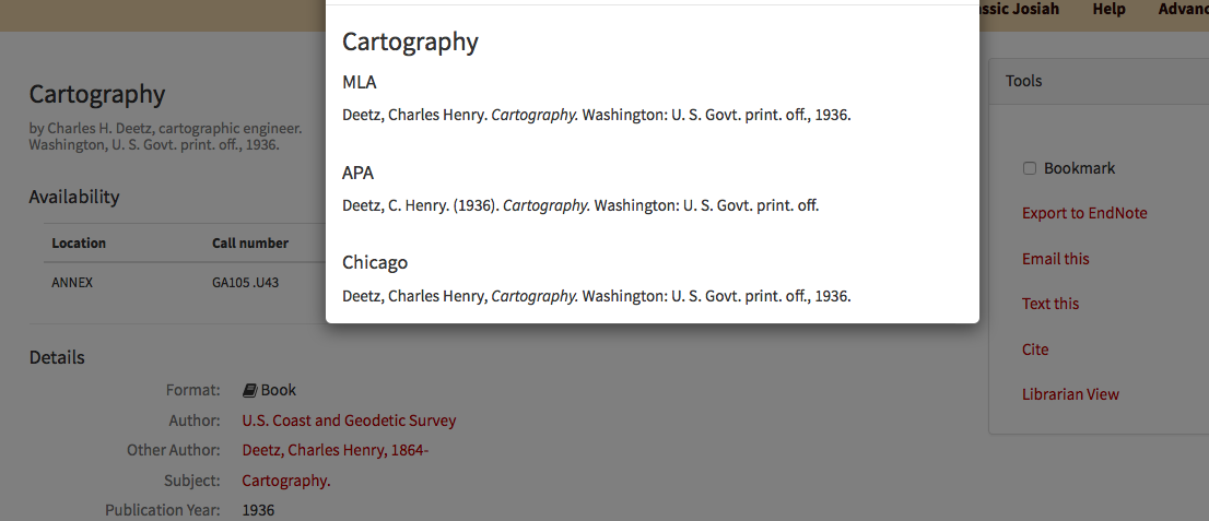 Created attachment 42971 [details] [review] Bug 14670: Add Cite-option to detail page in OPAC Adds a "cite" option in the tools menu in OPAC detail page for easy citations. Test plan: 1. Apply this patch 2. Got to OPAC detail page 3. In the tools menu to the right, click the new "Cite" link 4. A modal should appear with four different citation styles (APA, Chicago, Harvard, MLA) Sponsored-by: Regionbibliotek Halland / County library of Halland