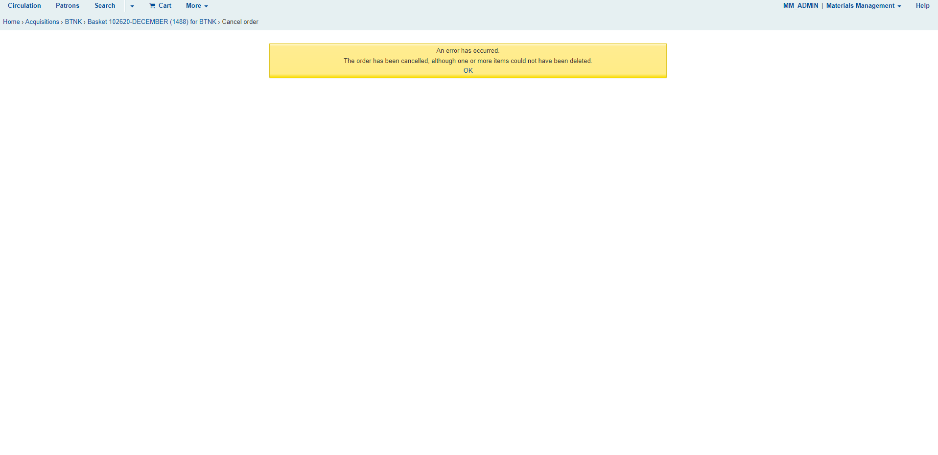 Whenever there is a hold on an item, when we reopen the basket and attempt to cancel the order under the "Cancel Order" section, the only option will be to "Cancel Order" if there is a hold on an item (the notification shows "Can't cancel order and delete catalog record" as well.) This is an obvious indication that a hold exists on the item. If there is not a hold on the item, you will be given the options to either "Cancel Order" or "Cancel order and delete catalog record."