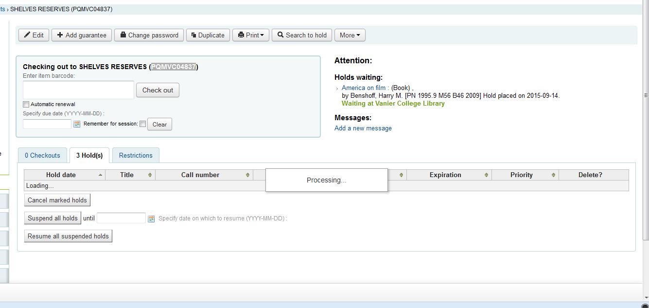 Created attachment 42690 [details] Image of freezing Holds tab display When trying to display the holds for a user, if an item has no holdingbranch, it causes the svc/holds service to crash and the display to freeze. Tentative steps to reproduce on any DB: 1) put 1 or more items on hold for a given user. 2) go into the database and set the item.holdingbranch to NULL 3) In the user's page, in checkouts (circulation.pl), click the tab that should be written 1 Hold(s) 4) It will be "Processing" indefinitely. See attached image. The cause is the svc/holds code that crashes. The fix will validate that there's an holdingbranch before proceding with the code.