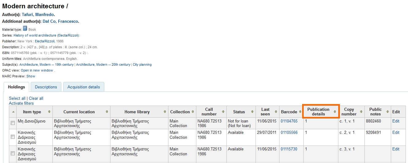 ./modules/catalogue/detail.tt contains the following header name [% IF ( volinfo ) %]<th>Publication details</th>[% END %] That displays data from enumchron that relates to data entered in 952h (Serial enumeration / chronology) The idea is to change the header in ./modules/catalogue/detail.tt to: [% IF ( volinfo ) %]<th>Serial enumeration / chronology</th>[% END %] in order for the item headers to be consistent across the system