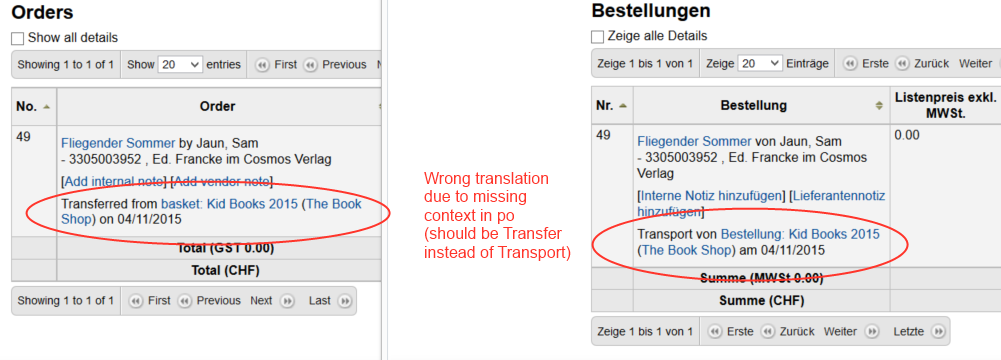Created attachment 44356 [details] Wrong translation of "Transferred" in basket In German, the word "Transfer" can be translated to "Transfer" or "Transport". Transfer would be used e.g. for transferring an order, transport is for transportation of e.g. books. This ambiguity leads to a wrong translation for transferred orders in Home > Acquisitions > [a vendor ] > [a basket] e.g. /cgi-bin/koha/acqui/basket.pl?basketno=14 See screenshot attached. The reason is that the word "Basket" is detached from the string "Transferred to" by the <a> tag.