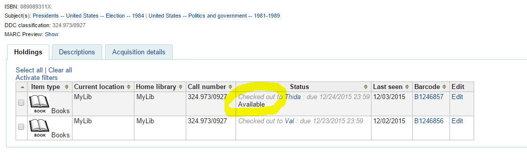 Hi Katrin, I have checked 2 things. There is no whitespace in branchcodes. And , I have already changed <institution id="MK">. But, It is still showing available status for checked out item.