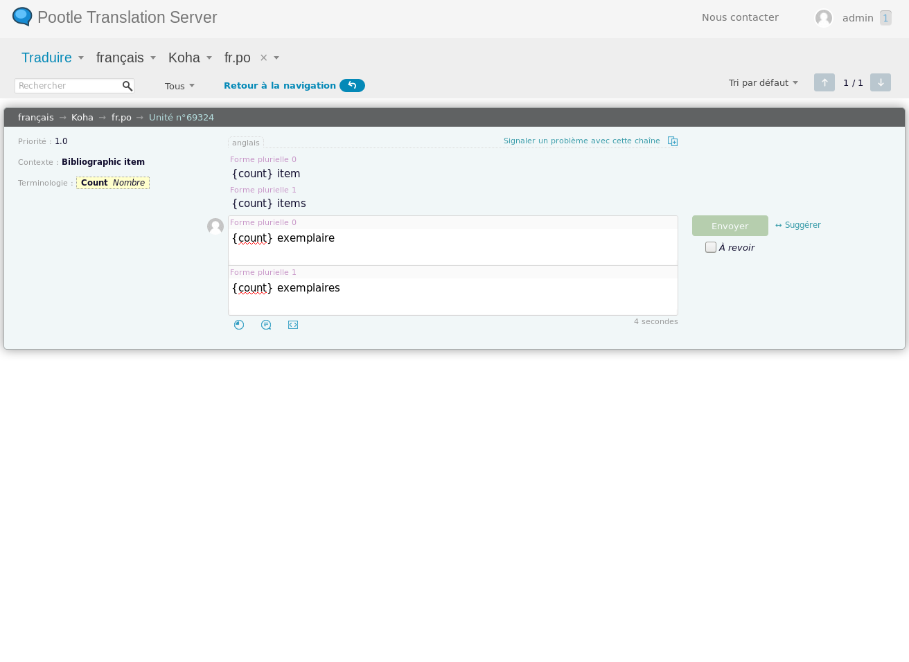 Hi Julian, I can not yet make it work. I think I missed something perl translate install fr-FR Use of uninitialized value $pref_name in concatenation (.) or string at LangInstaller.pm line 202. Use of uninitialized value $pref_name in concatenation (.) or string at LangInstaller.pm line 244. SKIPPING ERROR MARKER IN HEADER: #-#-#-#-# Koha-perl.pot (PACKAGE VERSION) #-#-#-#-# SKIPPING ERROR MARKER IN HEADER: #-#-#-#-# Koha-js.pot (PACKAGE VERSION) #-#-#-#-# Vales are not replaced in .tt file: [% SEARCH_RESULT.items_count %] [% tn('item', 'items', SEARCH_RESULT.items_count) %](...) I would expect: [% SEARCH_RESULT.items_count %] [% tn('exemplaire', 'exemplaires', SEARCH_RESULT.items_count) %](...) This is the .po file after editing Plural forms: ------------ # FIRST AUTHOR <EMAIL@ADDRESS>, YEAR. # #, fuzzy msgid "" msgstr "" "Project-Id-Version: PACKAGE VERSION\n" "Report-Msgid-Bugs-To: \n" "POT-Creation-Date: 2017-04-06 10:52+0200\n" "PO-Revision-Date: YEAR-MO-DA HO:MI+ZONE\n" "Last-Translator: FULL NAME <EMAIL@ADDRESS>\n" "Language-Team: LANGUAGE <LL@li.org>\n" "Language: \n" "MIME-Version: 1.0\n" "Content-Type: text/plain; charset=UTF-8\n" "Content-Transfer-Encoding: 8bit\n" "#-#-#-#-# Koha-perl.pot (PACKAGE VERSION) #-#-#-#-#\n" "Plural-Forms: nplurals=2; plural=(n > 1);\n" "#-#-#-#-# Koha-js.pot (PACKAGE VERSION) #-#-#-#-#\n" #: koha-tmpl/intranet-tmpl/prog/en/modules/catalogue/results.tt:1 msgid "item" msgid_plural "items" msgstr[0] "exemplaire" msgstr[1] "exemplaires" ---------------