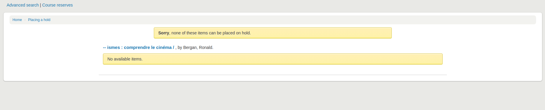 Thanks Tomás ! This is a great enhancement, it works as excepted ! I just have suggestion about the error messages that don't explain the reason hold can't be place : - opac : There are no items that can be placed on hold. - staff client : Cannot place hold - No items are available to be placed on hold. I let the QA team decide, but I think it could be clearer for users (pro + patrons) if we could add something like "You've reached the daily limit for holds".