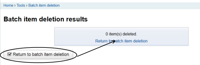 Aleisha, when deleting items using the batch item deletion tools, I now get 2 "Return to batch item deletion": 1 button and 1 link.