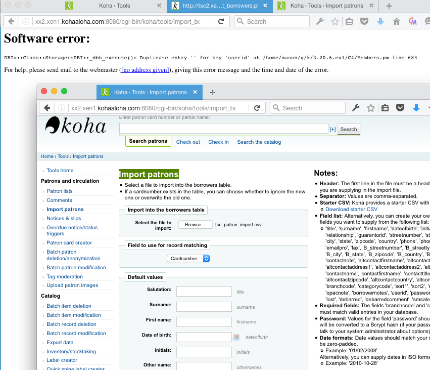 (In reply to Mason James from comment #2) > (In reply to Mason James from comment #0) > > to replicate the bug > > > > 1/ import a borrowers.csv file containing any row with a blank 'userid' > > value, > > - use the 'overwrite' option. > > > > actually the bug is triggered using *any* duplicated 'userid' value, not > just "" ..which means if you import any .csv file twice (with overwrite option), the error is triggered