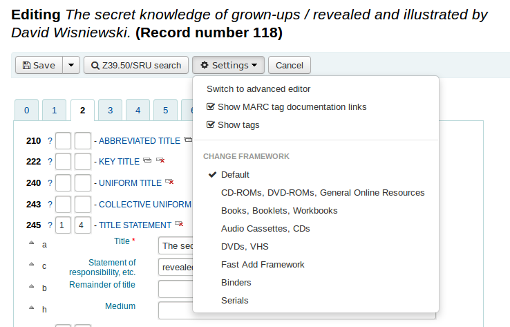 Created attachment 48231 [details] Screenshot of the proposed change I think it would simplify the "basic" MARC editor a little to move some controls into a "Settings" menu similar to the one in the advanced editor. I propose that these items be included in the menu: - Switch to advanced editor - Show MARC tag documentation links - Show tags - Change framework