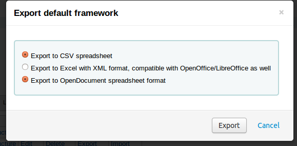 Some of this has been fixed (the radio buttons work as expected now), but the default framework only ever exports as .ods file.
