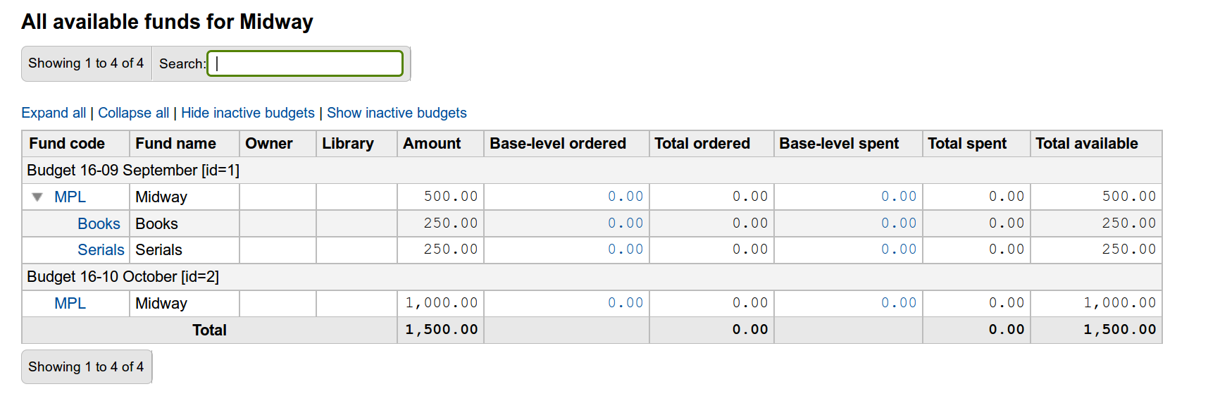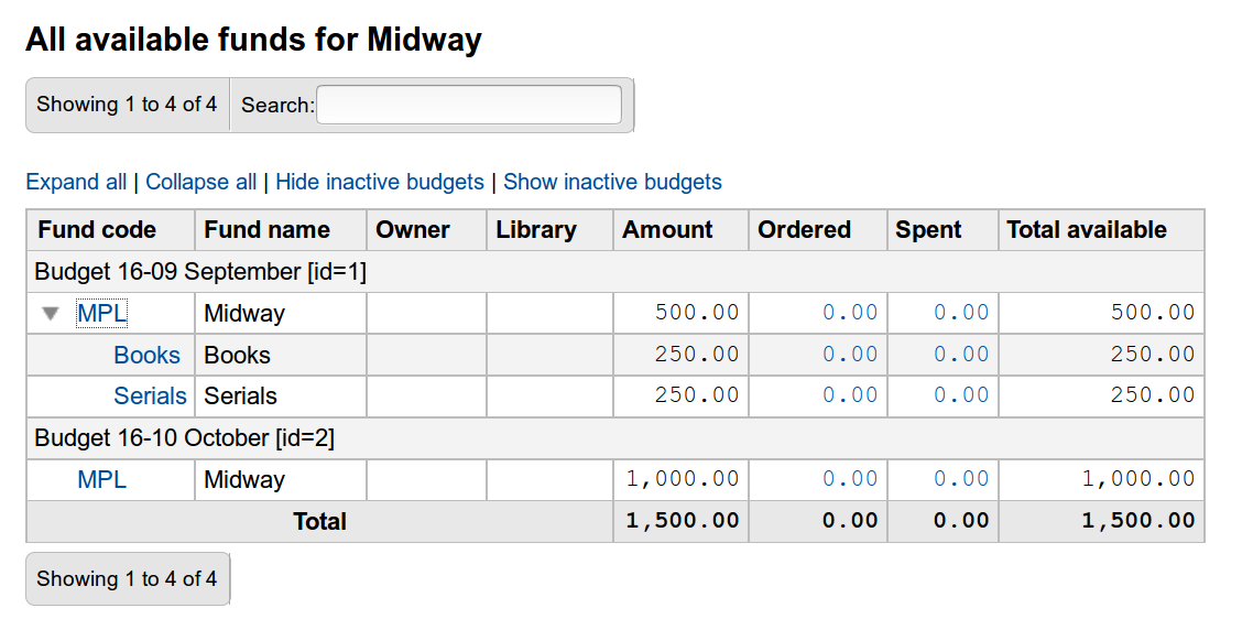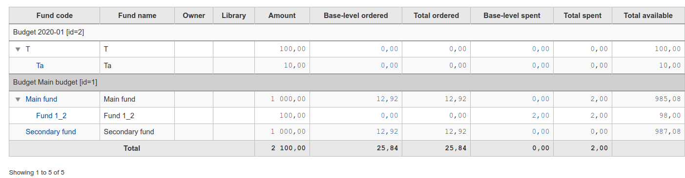 I found this after having tested bug 23767 earlier and I think we should think about merging both bugs in a way - they deal with very similar problems. I will move both to 'in Discussion' meaning that I hope you can talk to each other and figure out the best way to move those 2 forward! 1) I notice the removal of the "Total available" here. I think this is one of the things libraries really look at - would it be possible to add it back? 2) Also in my case I have the following: Parent fund, spent: 0,00 Sub fund, spent: 2,00 For Total spent: It shows on both parent and sub fund level, adding up to 2 still. = OK For Base-level spent: 2,00 shows, but is added up to 0,00 Total. So... the totals are quite confusing: 2+2 = 2 2+0 = 0 As it's the same we display on budget, maybe adopting the "italic" formatting from the budgets page could help a little here. Attaching a screnshot.