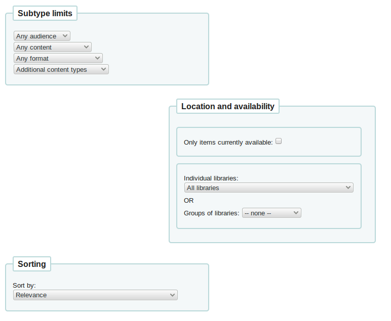 Hi Aleisha, did you see the more/fewer options are configurable with system preferences? Maybe that's one of the differences between yours and Owen's view. (OpacAdvSearchMoreOptions, OpacAdvSearchOptions)
