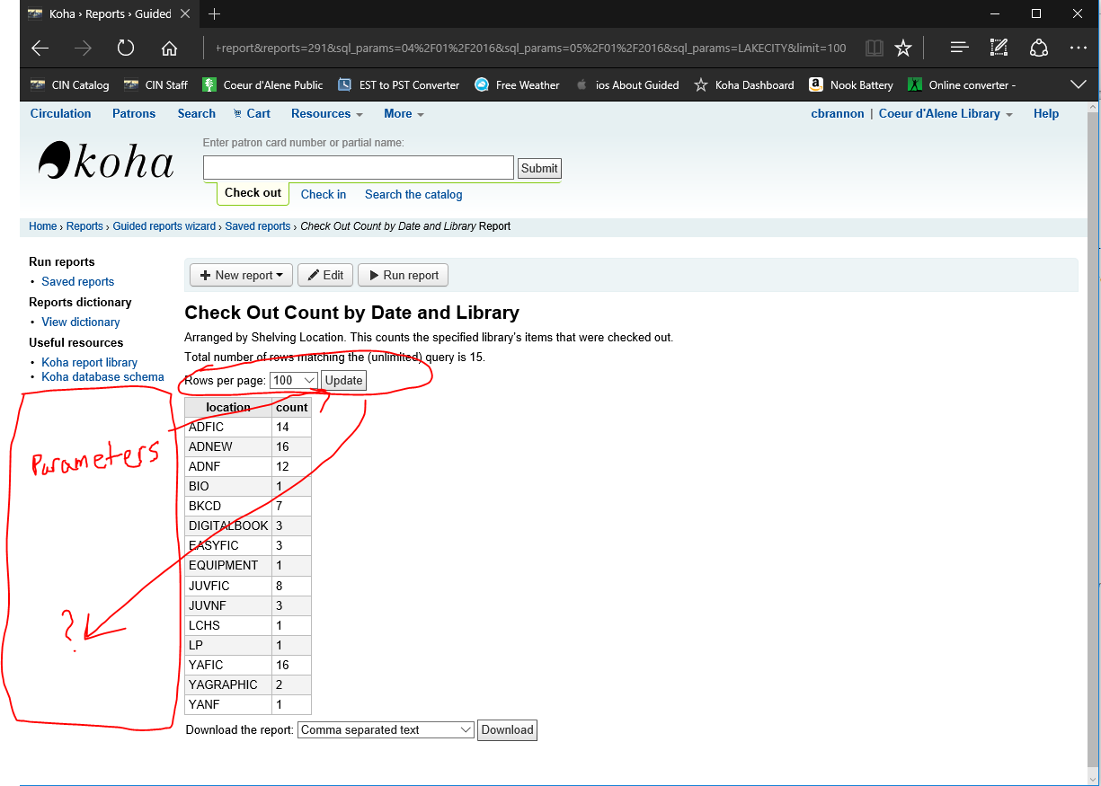 Created attachment 51217 [details] Placement of report parameters on report results. Let's say you have a report that asks you for parameters. You run the report, get the results, and then you want to run the report again with different parameters. Or maybe you made a mistake and need to change it. Yes, you could back up and change things and run it again. But what if the parameters were showing over on the left of the report under the "Useful resources" section? You could see what you set, and change whatever you needed and then click update. Perhaps the row setting and update button could also be on the left of the report. Just a thought. I was able to change a parameter up in the URL, and hit update, and it worked. It was nice because I set the report to show more than 20 records, and I didn't have to repeat that step after updating. Christopher