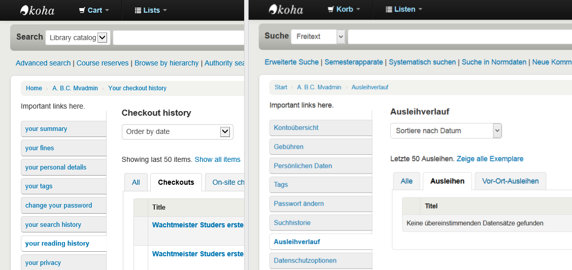 In koha-tmpl/opac-tmpl/bootstrap/en/modules/opac-readingrecord.tt the filter for the tabs 'Checkouts' and 'On-site checkouts' uses text that is exposed to translation. If they are translated, the tabs will be empty on translated pages. (Note: Enable syspref OnSiteCheckuts for testing) See opac-readingrecord.tt line 83ff: [% IF issue.onsite_checkout %] onsite [% ELSE %] checkout [% END %] E.g. in German (/de-DE/modules/opac-readingrecord.tt), it translates to: [% IF issue.onsite_checkout %] vor Ort [% ELSE %] ausgeliehen [% END %] It should be the same as in the English version. A very dirty workaround would be not to translate 'onsite' and 'checkout' in Pootle. Most problably other language will fall into this trap as well.