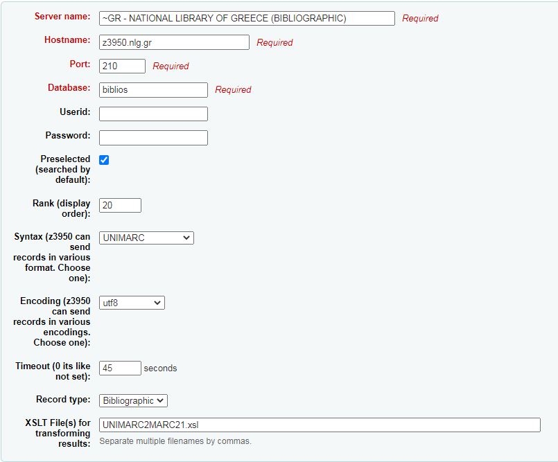 Created attachment 123177 [details] Search against National Library of Greece, target settings
