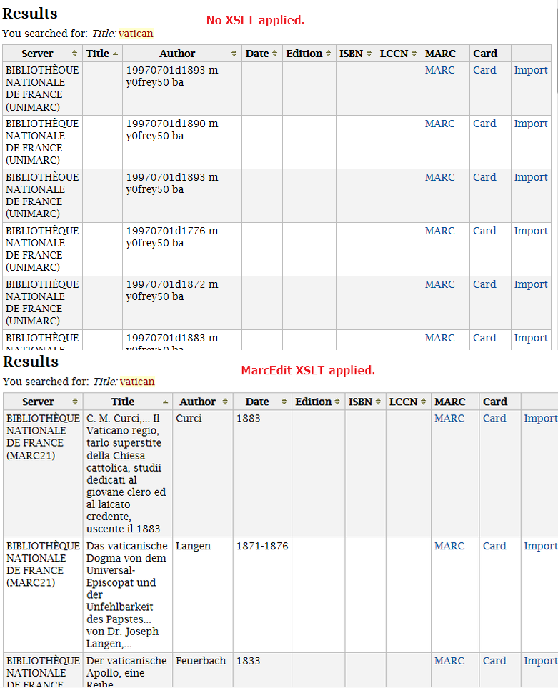 Created attachment 53333 [details] Image showing Z39.50 search results both with and without MarcEdit XSLT applied